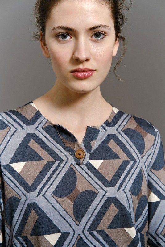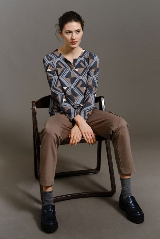 Camiseta de Guitare. Con un estampado geometrico de punto. De manga larga. Corte recto. Manga larga. Cuello tunecino, con boton. Color: Piedra y Petroleo.
